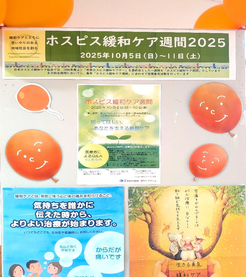 当院では、今年度も「ホスピス緩和ケア週間」に合わせた取り組みを実施しました。この週間は、ホスピス・緩和ケアの理解を深め、より多くの方々にその大切さを知っていただくことを目的としています。「緩和ケア」というと、人生の最終段階に受ける特別な医療というイメージを持たれる方も少なくありません。しかし、実際には、がんなどの診断を受けた時から、痛みやつらさを和らげることを目的に始められる医療です。患者さんやご家族の心身の負担を軽くし、その人らしく過ごせるよう支えるのが緩和ケアの役割です。